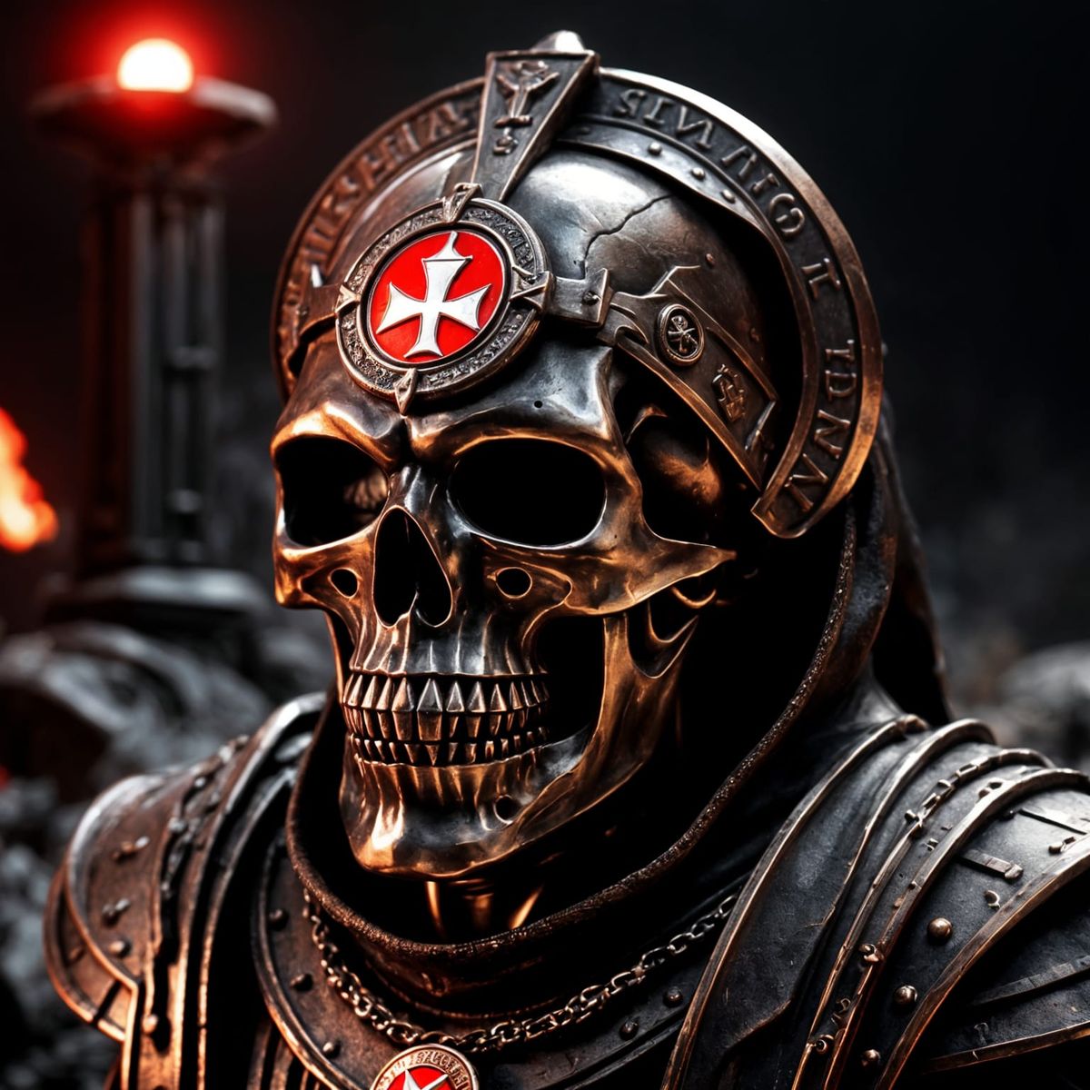 This image shows a sinister bronze skull emblem associated with a charitable organization. The design evokes themes of witchcraft and apocalyptic horror, rendered with dynamic lighting and intricate detail.