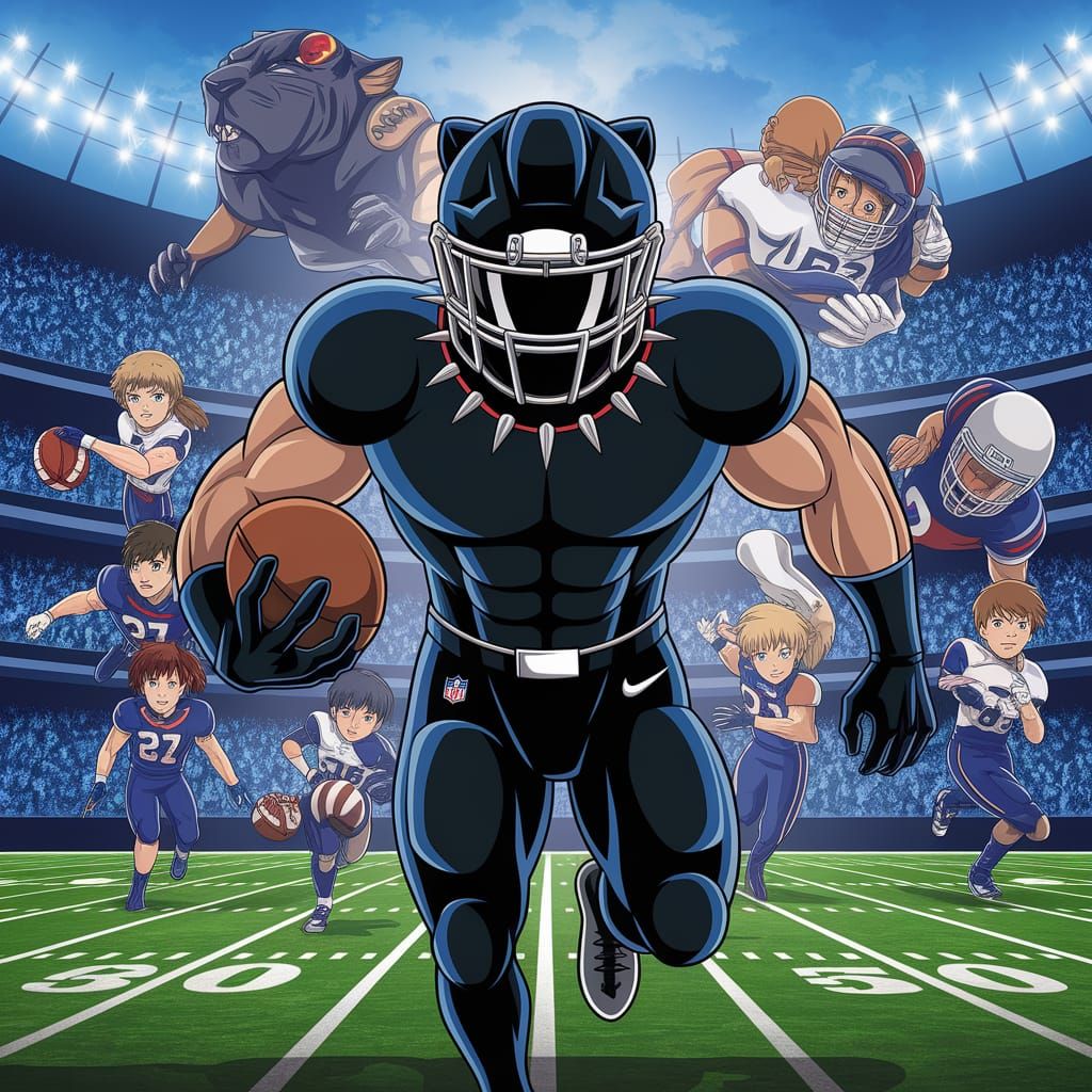 This image showcases a muscular Black Panther football player in a high-energy anime key visual, bursting through defenses in a vibrant night game setting, surrounded by flashing lights and a sense of intense competition.