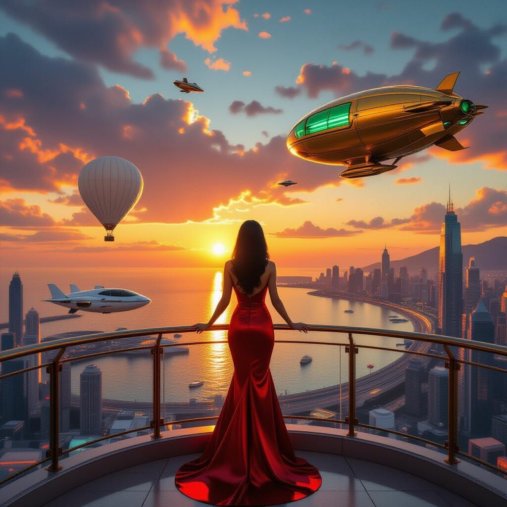 This image shows a woman in a red satin dress on a balcony, viewing a hyperrealistic retro-futuristic city at sunset. Features include air railways, flying cars, and a large blimp.