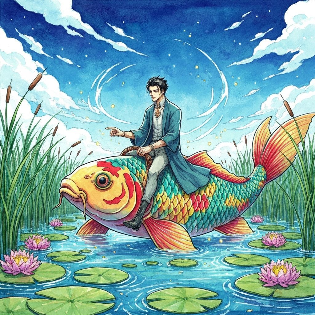 A vivid manga-style image of a stylish man riding a giant koi fish in a lily pond. The artwork features vibrant watercolors, intricate details, and expressive ink lines in a fantasy aesthetic.