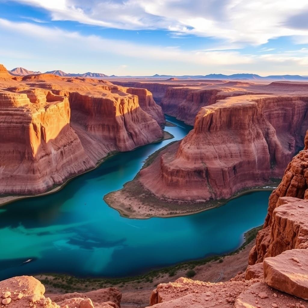 A vibrant landscape showing a canyon with turquoise rivers running through the desert valley. The scene radiates with deep blues and greens, showcasing the beauty of the canyon.