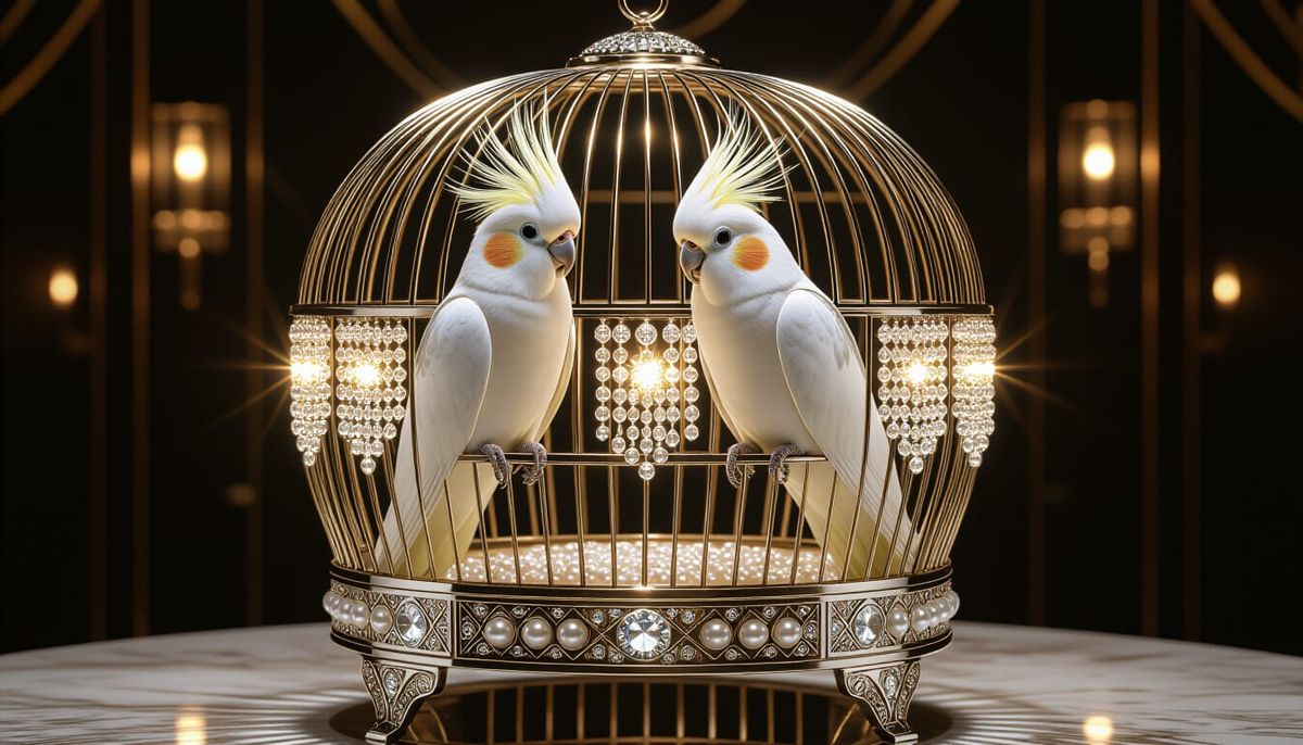 This image showcases two white cockatiels in an opulent Art Deco bird cage. The cage features sleek platinum lines, inset diamonds, and cascading pearls, evoking 1920s glamour.