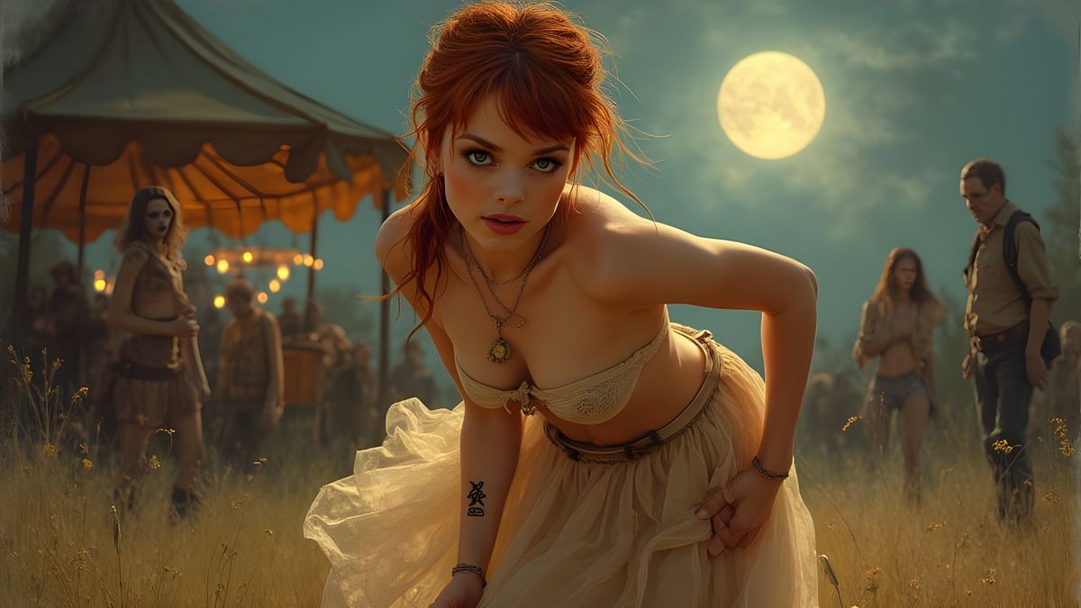 A vintage pin-up style image of a playful woman picking up an axe at a zombie-filled harvest festival under moonlight, blending mischief and natural beauty.