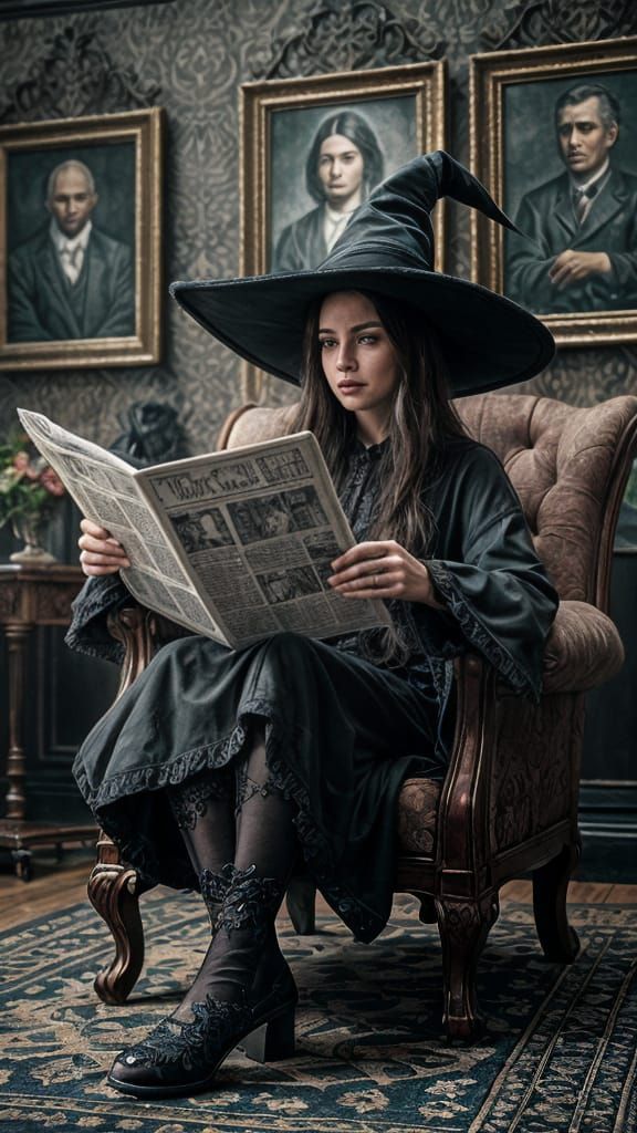 A hauntingly beautiful image of a young woman in a vintage room, surrounded by gothic-style portraits and steampunk elements, with a mysterious atmosphere and muted tones.