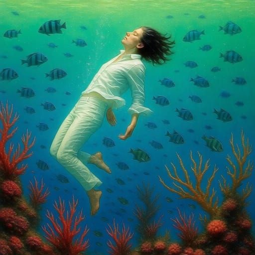 This image shows a person underwater, appearing serene and at peace. Vibrant coral and fish surround them in this surreal underwater scene. The image has a dreamlike quality, rendered as digital art.