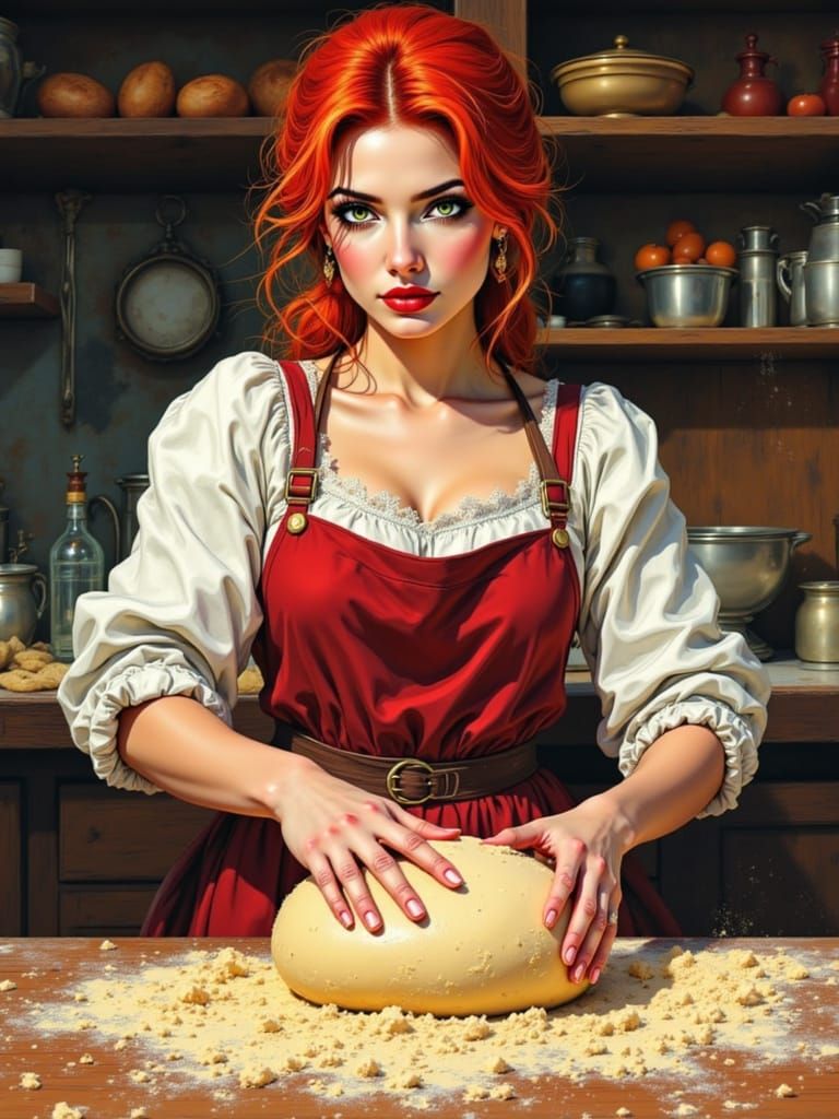 This image depicts a 1500s redhead baker with flour on her face and apron, focused on kneading bread dough in a lively kitchen setting. The style evokes classic comic art.