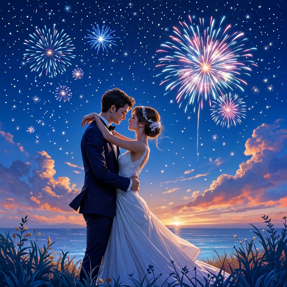 This image shows a couple in evening wear embracing beneath a starry sky with fireworks. The scene is rendered in a whimsical, painterly style with vibrant colors.