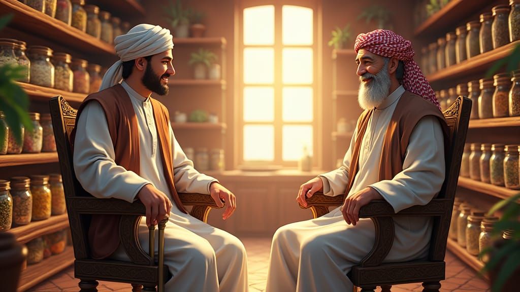 A serene image of two Arab men in peaceful conversation within a traditional Arabic herbal shop, surrounded by vibrant herbs, exotic spices, and rustic wooden shelves, bathed in warm daylight and tranquil atmosphere.