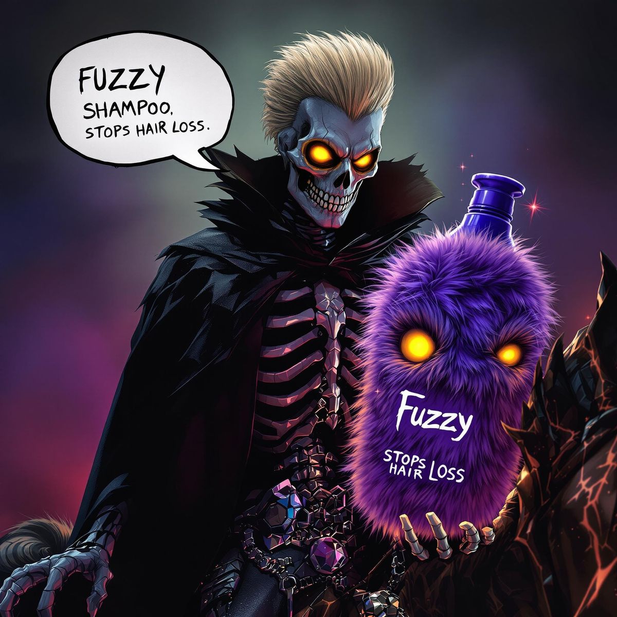 A striking portrait of Death from the Disc World novels, holding a mysterious creature and a shampoo bottle, with a sinister smile and illuminating yellow eyes. This vivid concept art features a skeleton in a black cloak, with intricate details and dynamic lighting, showcasing the power of Fuzzy Shampoo.