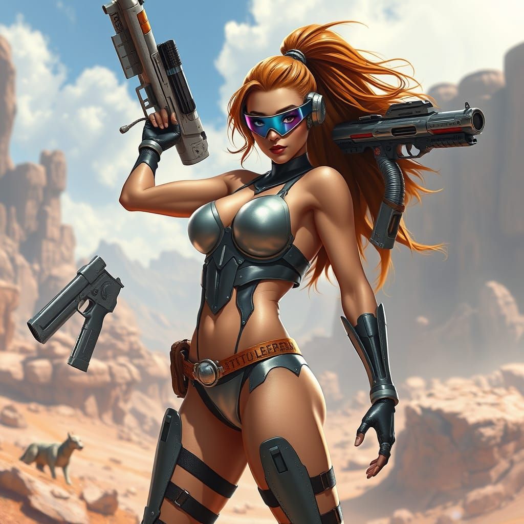 This image shows a heroic female warrior in a sleek metallic bikini, standing strong in a futuristic landscape, blending digital painting and 3D rendering aesthetics.