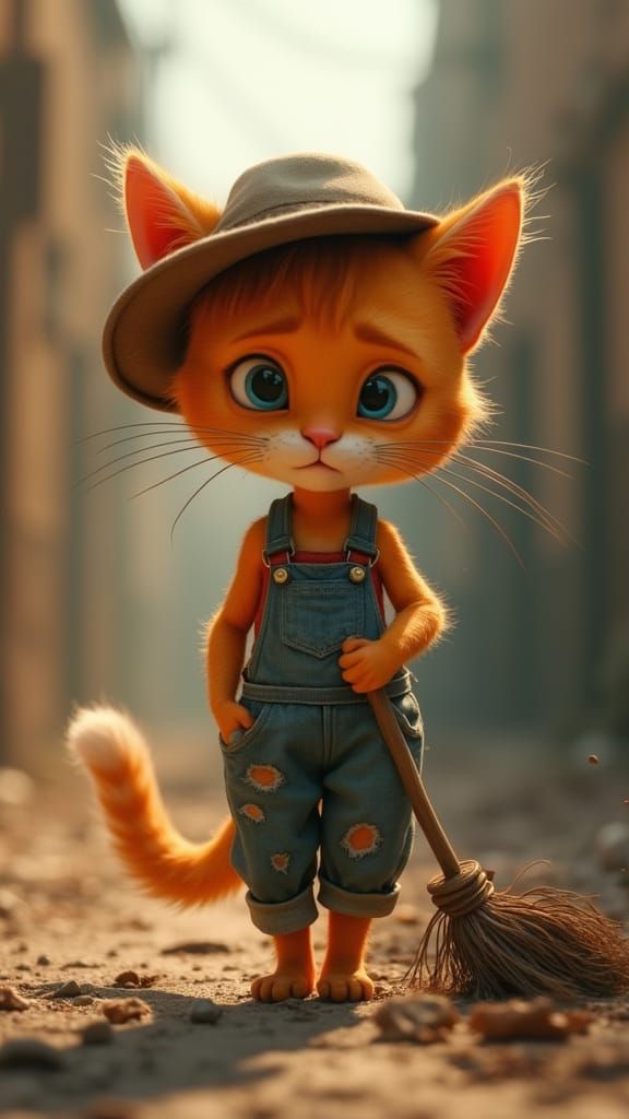 This image shows a poignant and detailed cartoon cat in a quiet morning alley, sweeping the ground with a broom, as a 3D rendered Pixar-style scene with a shallow depth of field and vibrant colors, reminiscent of Makoto Shinkai's attention to detail and Glen Keane's expressive character design.