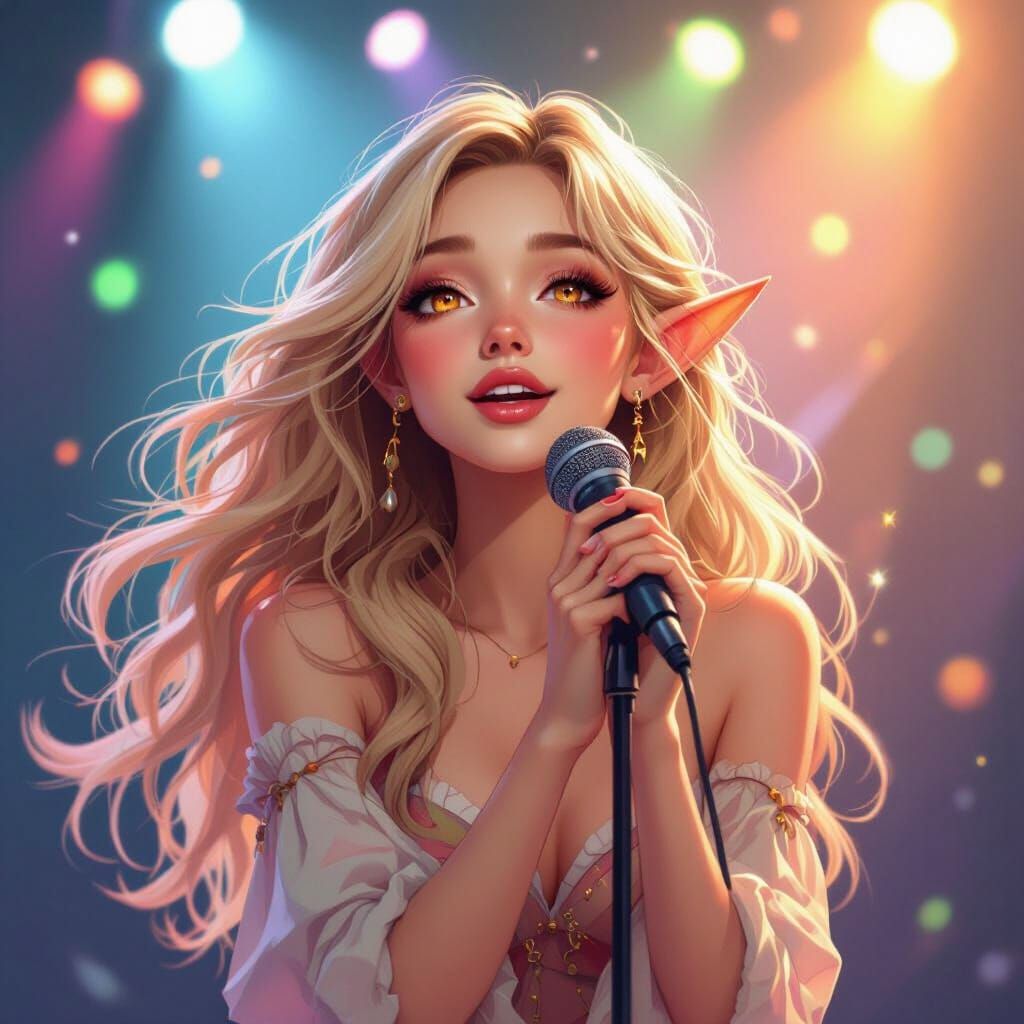 A strawberry blonde elf with amber eyes sings on stage, illuminated by vibrant, swirling colored lights, her hair gently moved by the wind. Rendered with a dreamy, ethereal aesthetic.