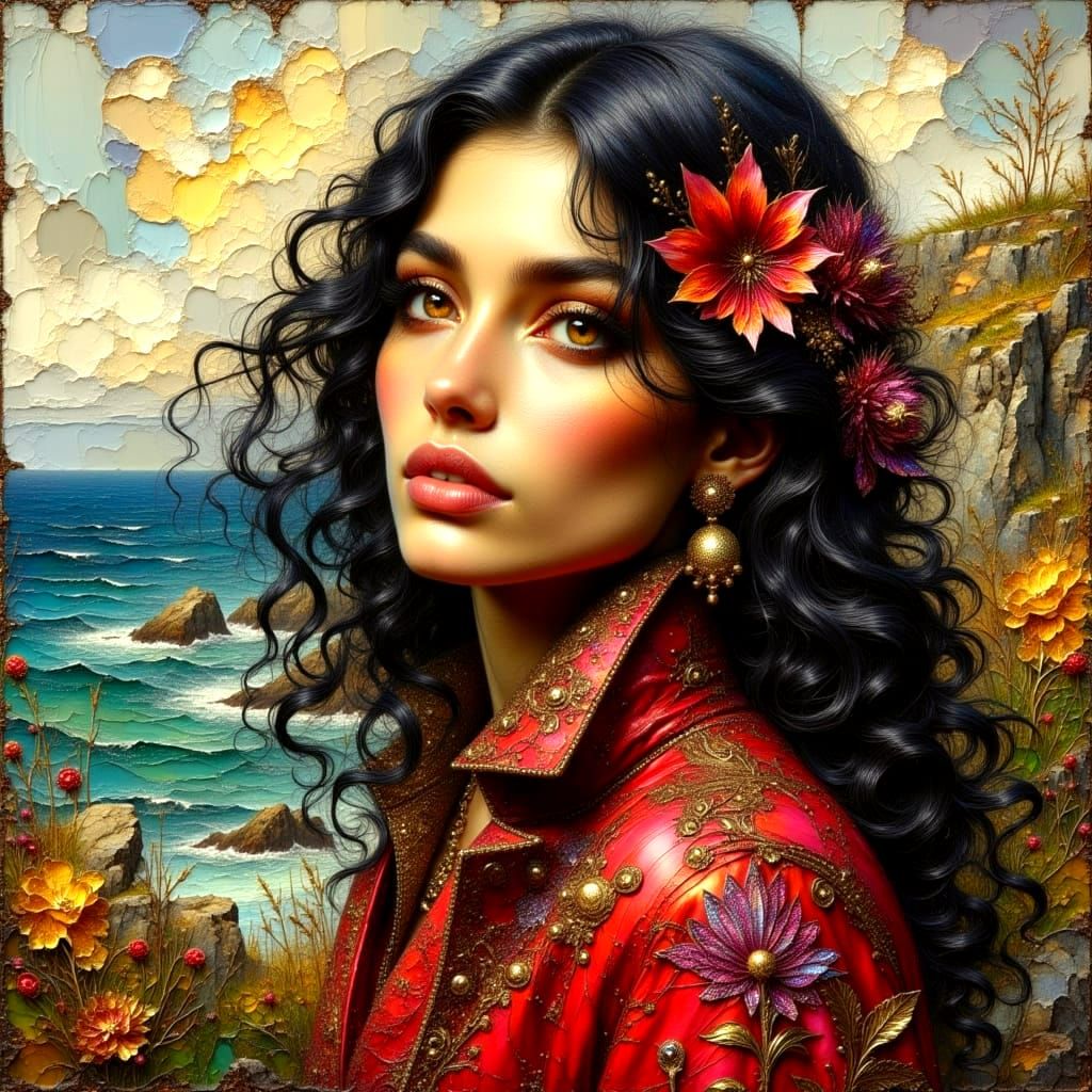 A stunning oil painting of a laughing Italian woman standing at the Cliffs of Moher, surrounded by the serene Irish landscape and vibrant, contrasting colors of the ocean and sunshine.
