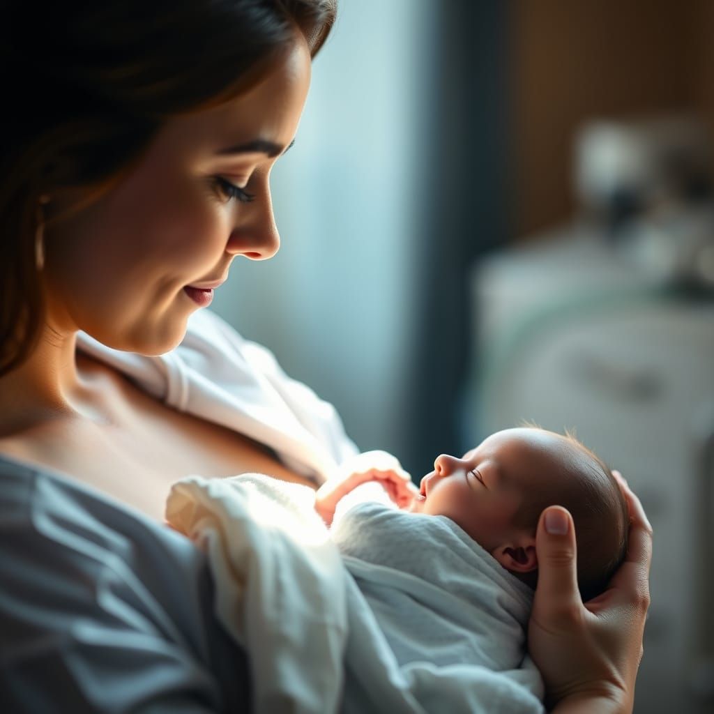 This photorealistic image captures a tender moment of a mother holding her newborn baby. Soft, warm light and a shallow depth of field create an intimate and heartwarming scene, emphasizing their connection.