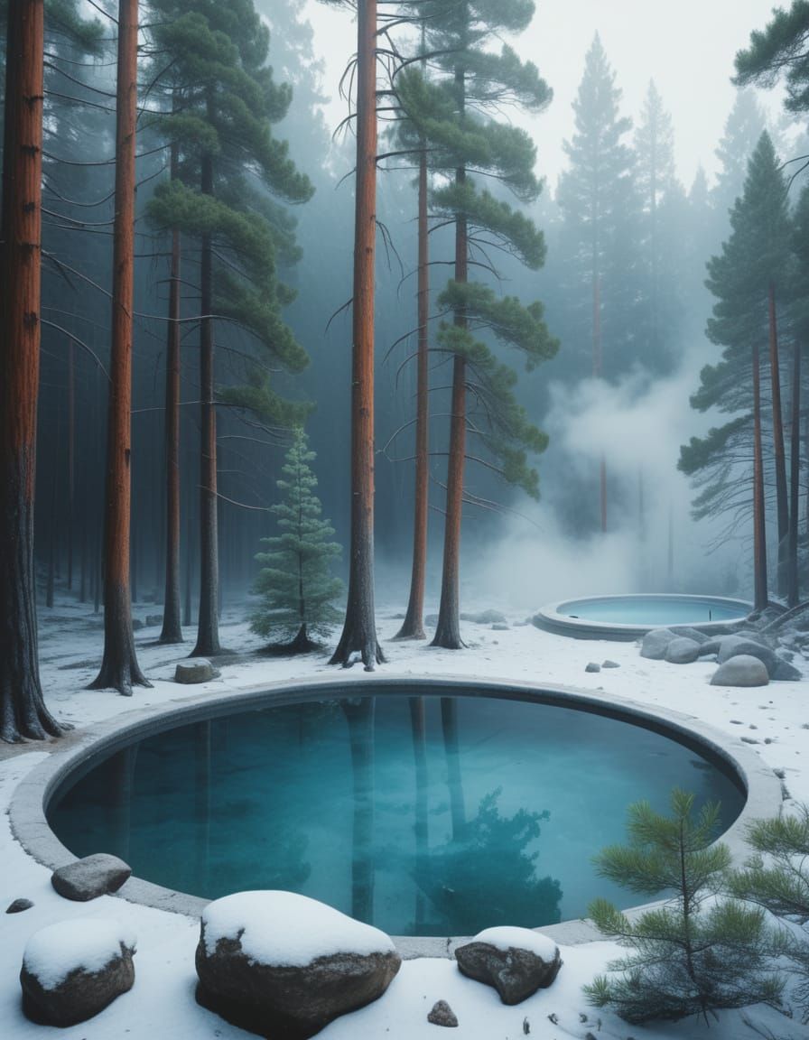 Generate your own foggy forest thermal bath scenes with clear blue hot water and steam. Free and easy AI image creation.