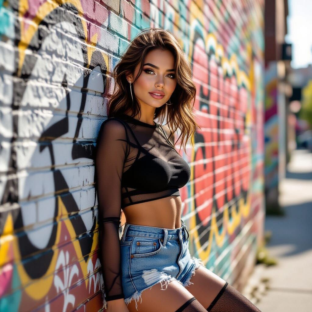 This image shows a confident young woman in ripped denim shorts leaning against a graffiti wall. The artwork features realistic textures, atmospheric lighting and expressive character rendering.