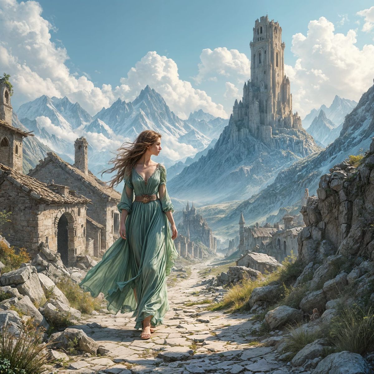 This image shows a beautiful, freckled wizardess walking through a crumbling village, surrounded by breathtaking mountains and a distant tower, in a stunning pastel fantasy illustration.