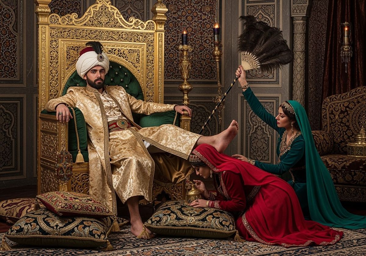 A photograph of an Ottoman Sultan relaxing on a throne with attendants in an opulent throne room, exhibiting intricate details and rich textures. The scene is lit with natural light and captured with sharp focus.