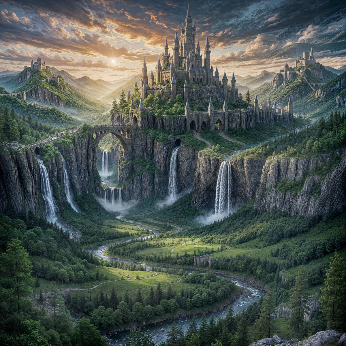 This cinematic fantasy painting showcases a grand, ancient stone castle with sharp towers, perched dramatically on a rocky precipice. Golden rays illuminate the scene, highlighting waterfalls and lush forests in high contrast.