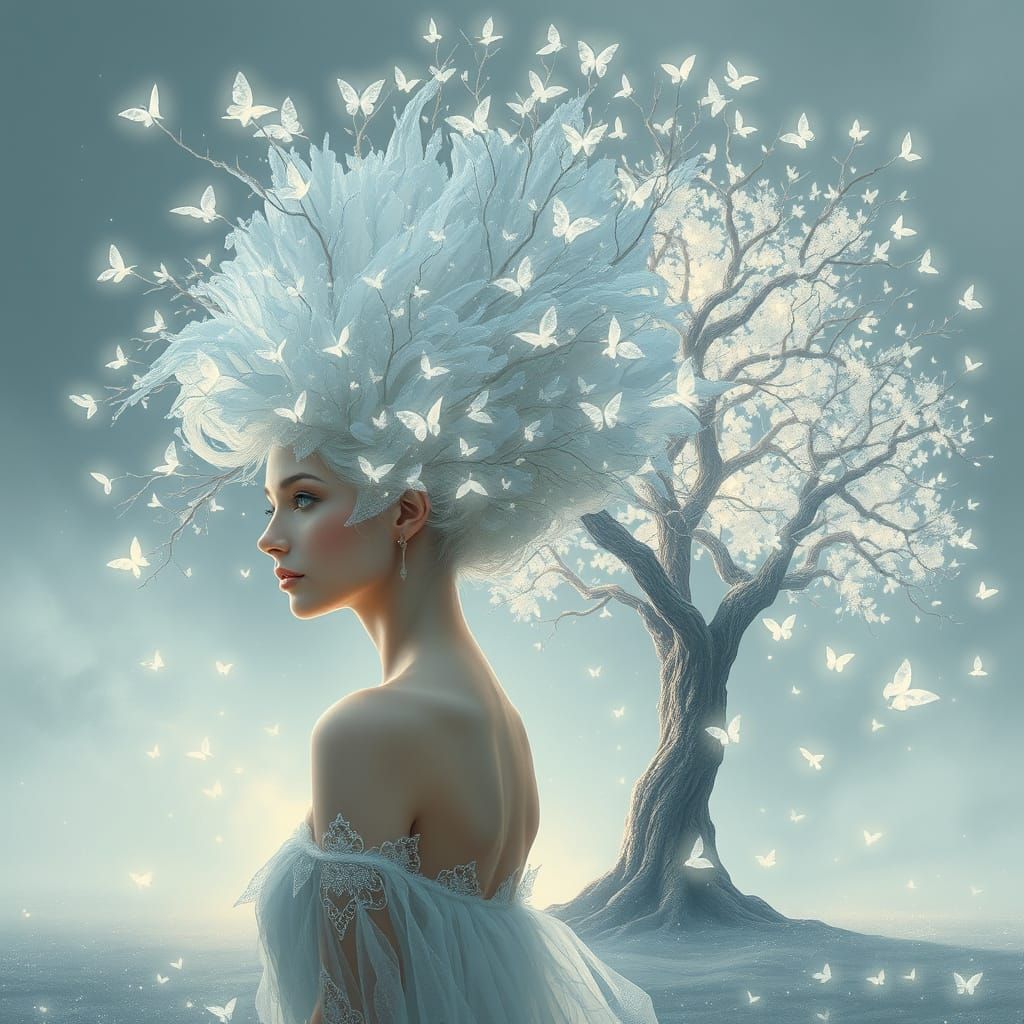 This image shows a woman with ice-like crystalline structures in her hair. She stands in a clearing with an ancient tree shedding leaves that morph into glowing butterflies, rendered in a soft, luminous Art Nouveau style.