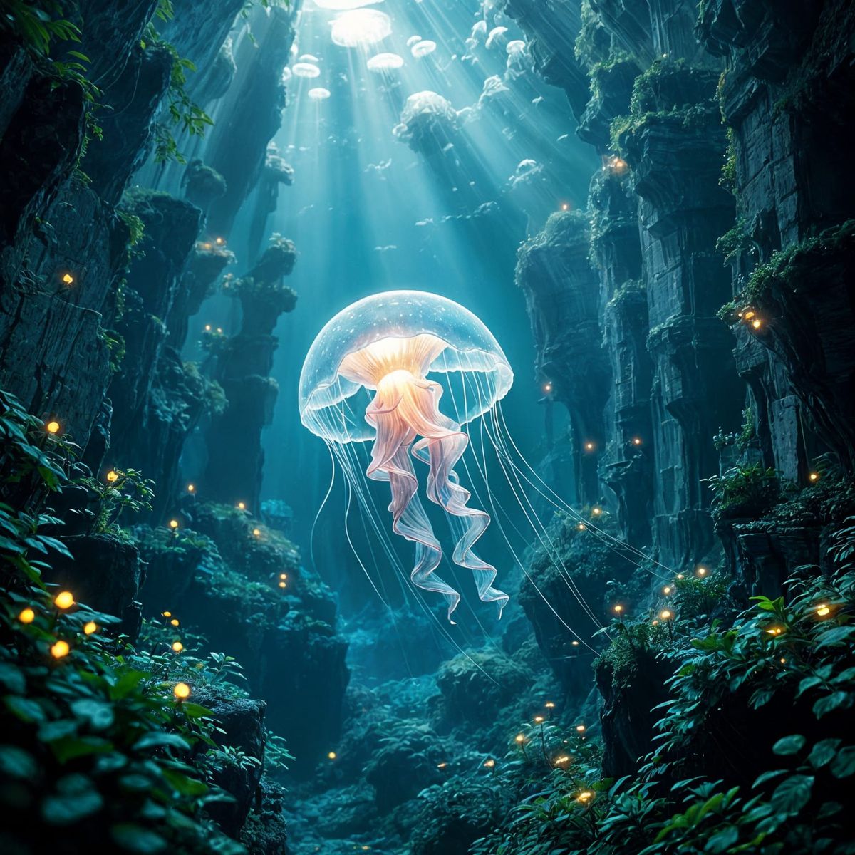 This image shows a bioluminescent jellyfish navigating the canyons of a ruined city reclaimed by nature. The scene is presented as a cinematic still with soft focus and muted colors.