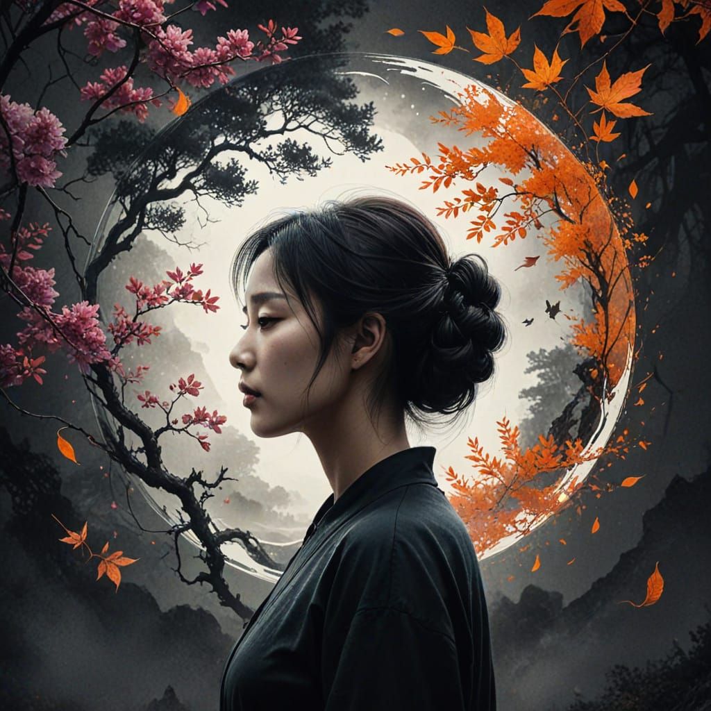 This digital art piece features a woman's silhouette blending with ethereal autumn blossoms and swirling leaves, set against a yin-yang landscape with cinematic lighting.