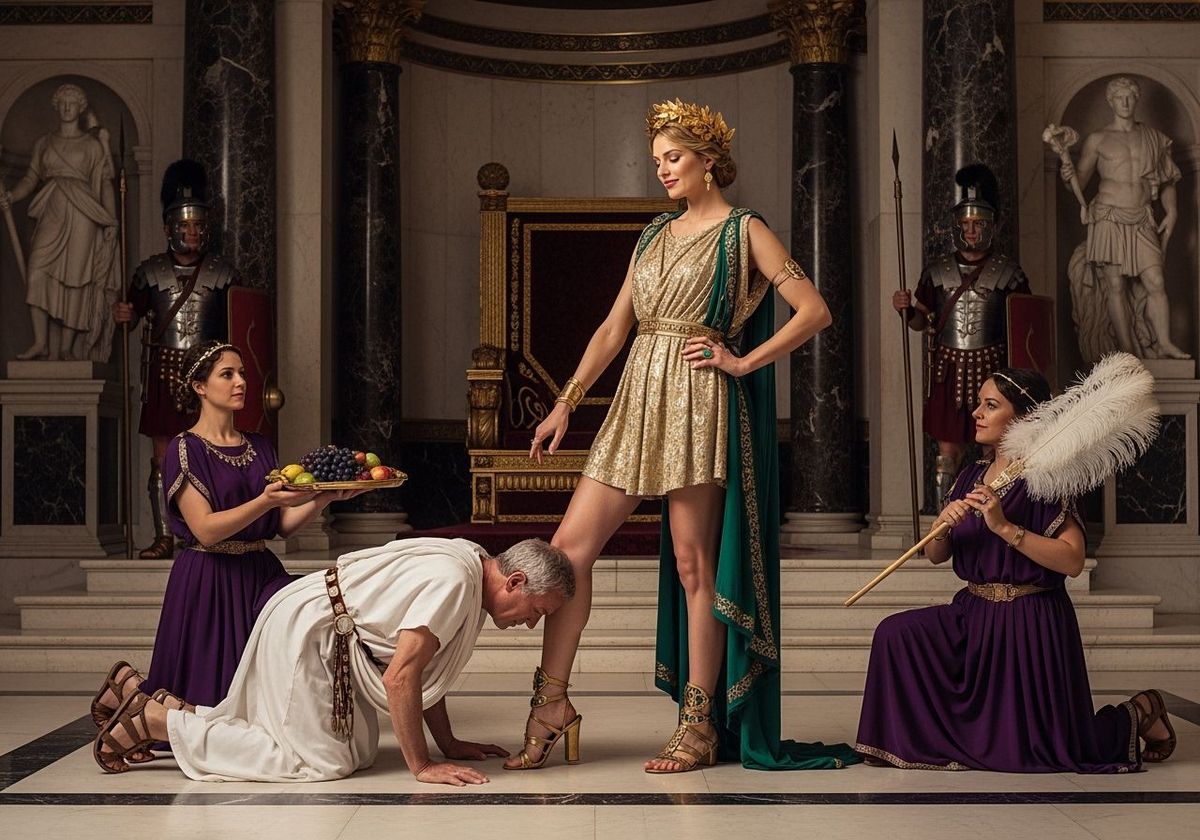 This image shows Empress Messalina in her throne room, adorned with gold and emeralds. A servant offers fruit, while another fans her. A senator bows before her as she tramples his head. The scene is captured as a full side view photograph.