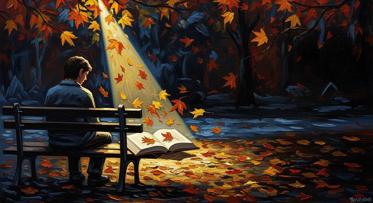 This image shows a solitary figure on a park bench, illuminated by a beam of sunlight on an open book. Rendered with bold, expressionist brushstrokes and surreal, psychedelic colors, it evokes intense light and shadow.