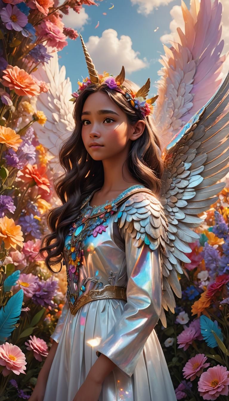 This image shows a girl with a unicorn horn and angel wings in a mid shot. The vibrant, colorful image has soft lighting and intricate textures, reminiscent of Pixar animation with a magical atmosphere.