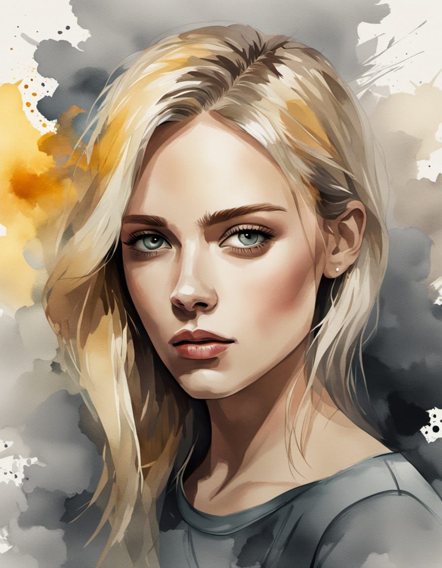 This watercolor portrait features a young woman with blonde hair against a gradient background. The artwork showcases soft brushstrokes, visible texture, and blended colors in a dreamy atmosphere.