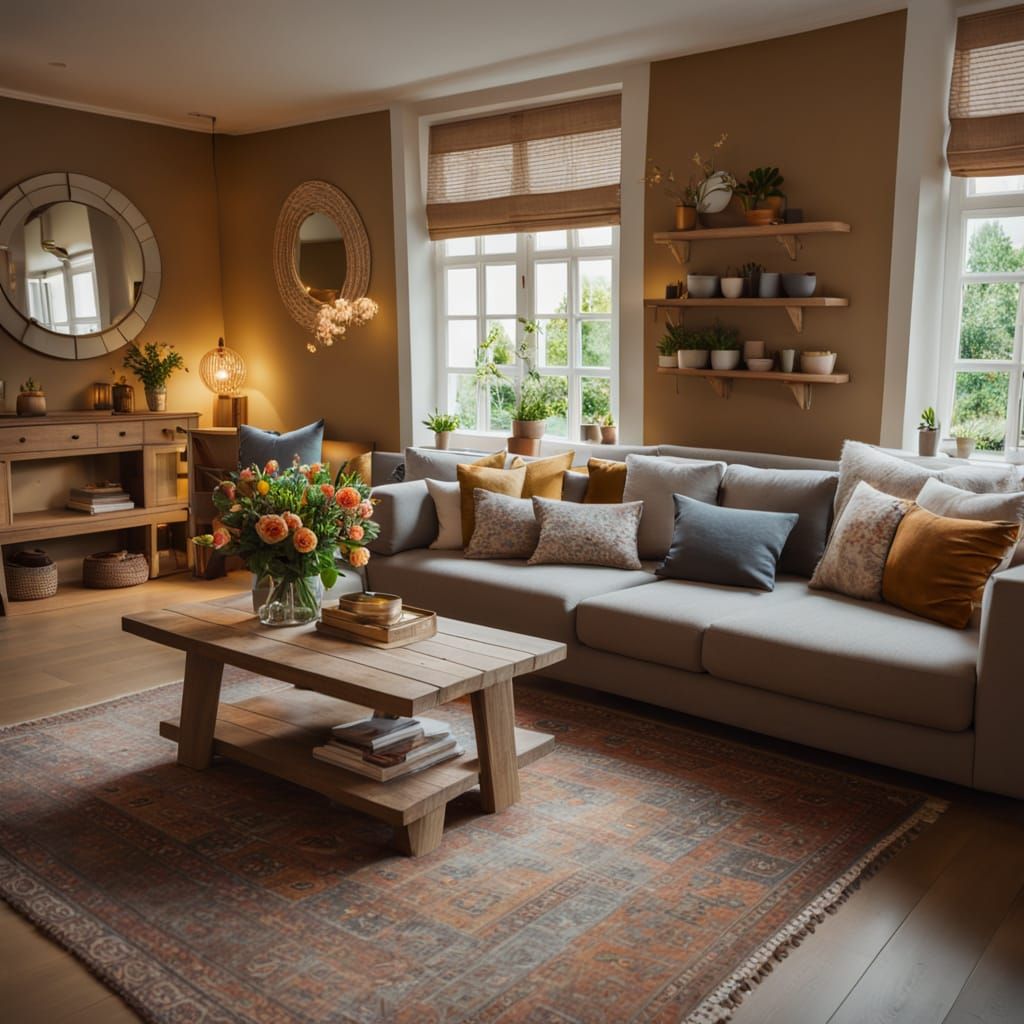 This image shows a beautifully decorated Dutch living room with warm golden lighting, plush rugs, and vibrant flowers. The space features soft cushions, wooden furniture, and rustic charm, creating a cozy and inviting atmosphere.