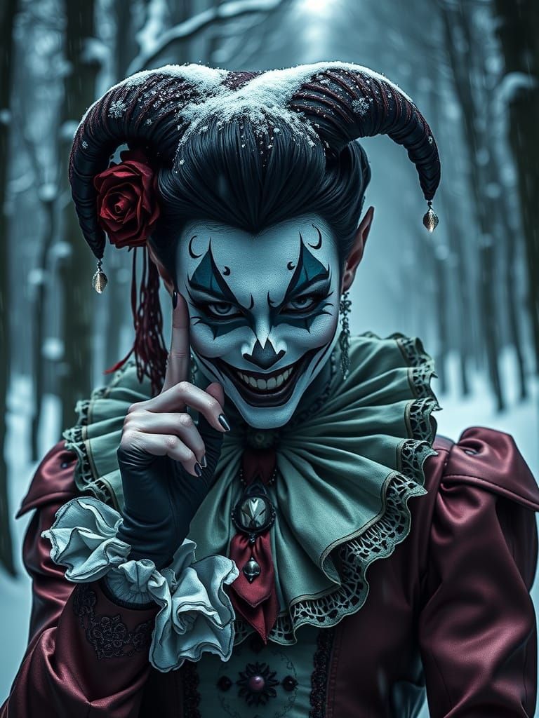 This image shows a harlequin woman in Victorian attire with a sinister smile. She is set against a winter forest backdrop with falling snow, rendered with intricate details and a cinematic atmosphere reminiscent of dark, moody art.