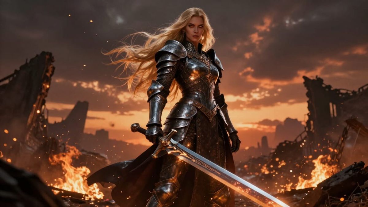 This image shows a powerful warrior woman in ornate armor on a ruined battlefield at sunset. Cinematic lighting and an epic atmosphere highlight her intense gaze and glowing sword.