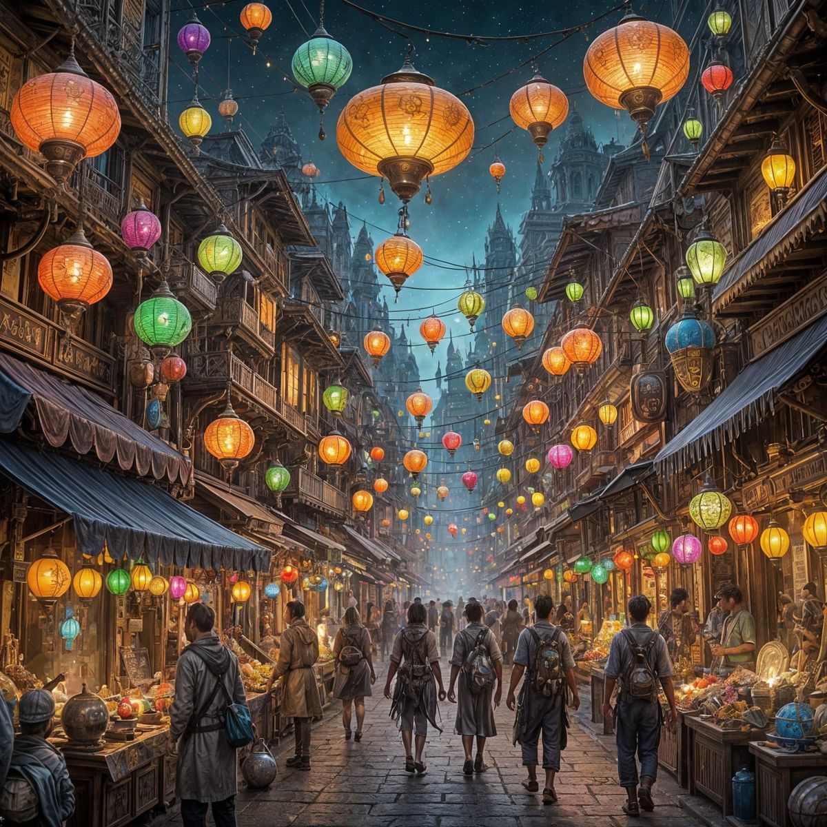 This image shows a vibrant alien marketplace at night, filled with exotic lanterns and bustling activity. Robotic vendors and alien creatures haggle amidst colorful smoke, depicted with vivid colors and intricate details as digital art.