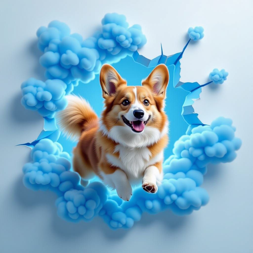 An imposing Welsh Corgi Pembroke dog leaps through blue smoke from a crack in the sky. Blue steam rises from the celestial rupture against a pure white background. Hyper-realistic rendering captures intricate fur detail and strong anatomy with sharp focus and studio-quality lighting.