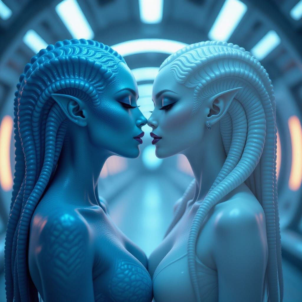 Generate your own stunning images of alien women kissing, easily and for free with our AI generator.