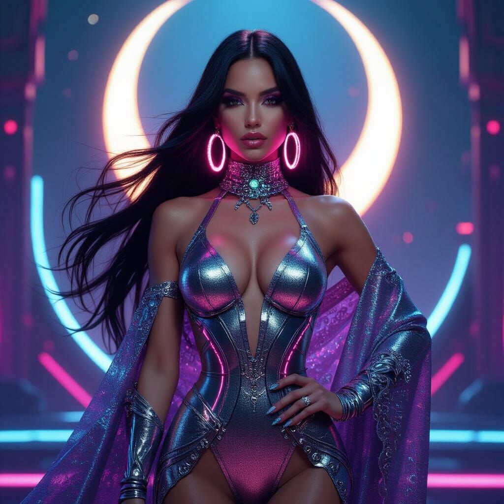 A vibrant image of a futuristic AI pop star performing on a cyberpunk stage. The Spanish performer's metallic bodysuit and holographic shawl catch the light, creating a dazzling display of high-fashion.