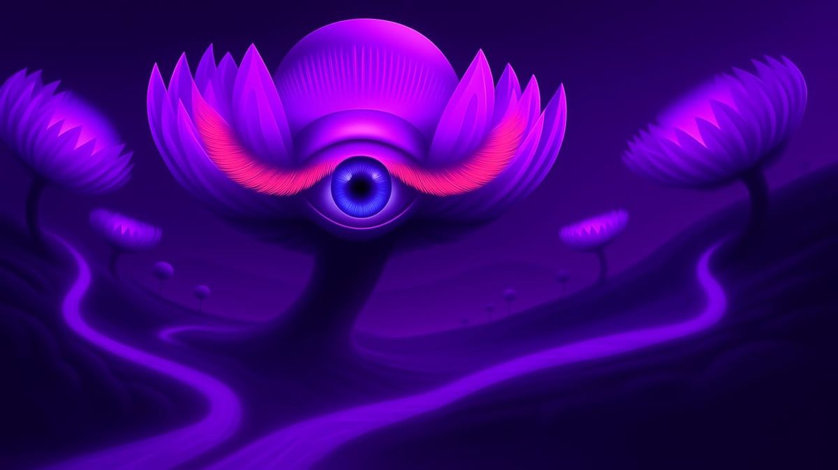 A striking picture of a surreal flower garden with giant, luminous alien flowers. The digital illustration features vibrant colors, intricate details, and glowing elements, creating a captivating and otherworldly scene.