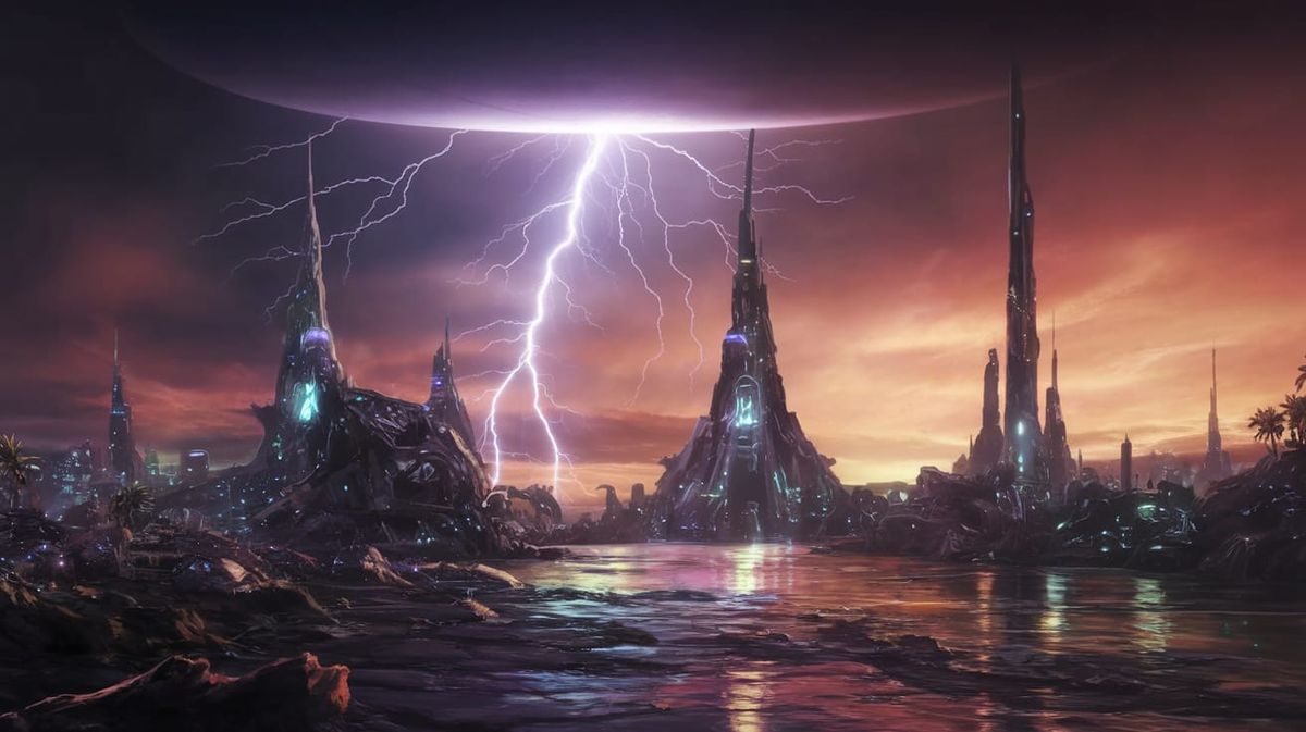 This image shows a dramatic, hyperrealistic depiction of lightning illuminating a vibrant, futuristic city on an alien planet. The cityscape is intricately detailed with a colorful background, showcasing a 2/3 face angle with side light effects.