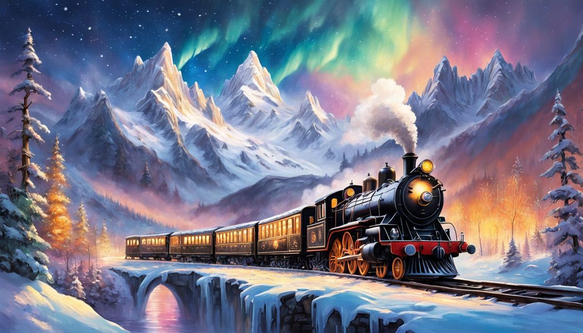 A highly detailed painting of a black and golden steam train traversing a snowy landscape under a vibrant aurora and starry sky. Ethereal lighting creates a fairy-tale wonderland.