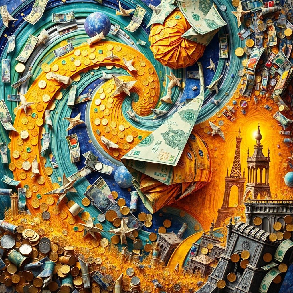 This image depicts a surreal cityscape constructed from money. Swirling galaxies of banknotes and rivers of coins surround giant origami animals in a dreamlike setting, rendered with opulent colors and intricate detail.