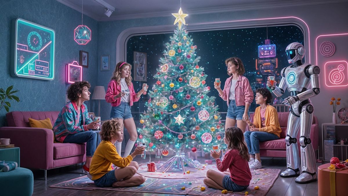 A family gathered around a glowing, holographic Christmas tree in a retro-futuristic living room. Their clothing is a blend of 80s fashion and futuristic materials, with neon accents. Geometric patterns and glowing panels adorn the walls, and a sleek, chrome-plated robot serves holiday drinks. The scene ...