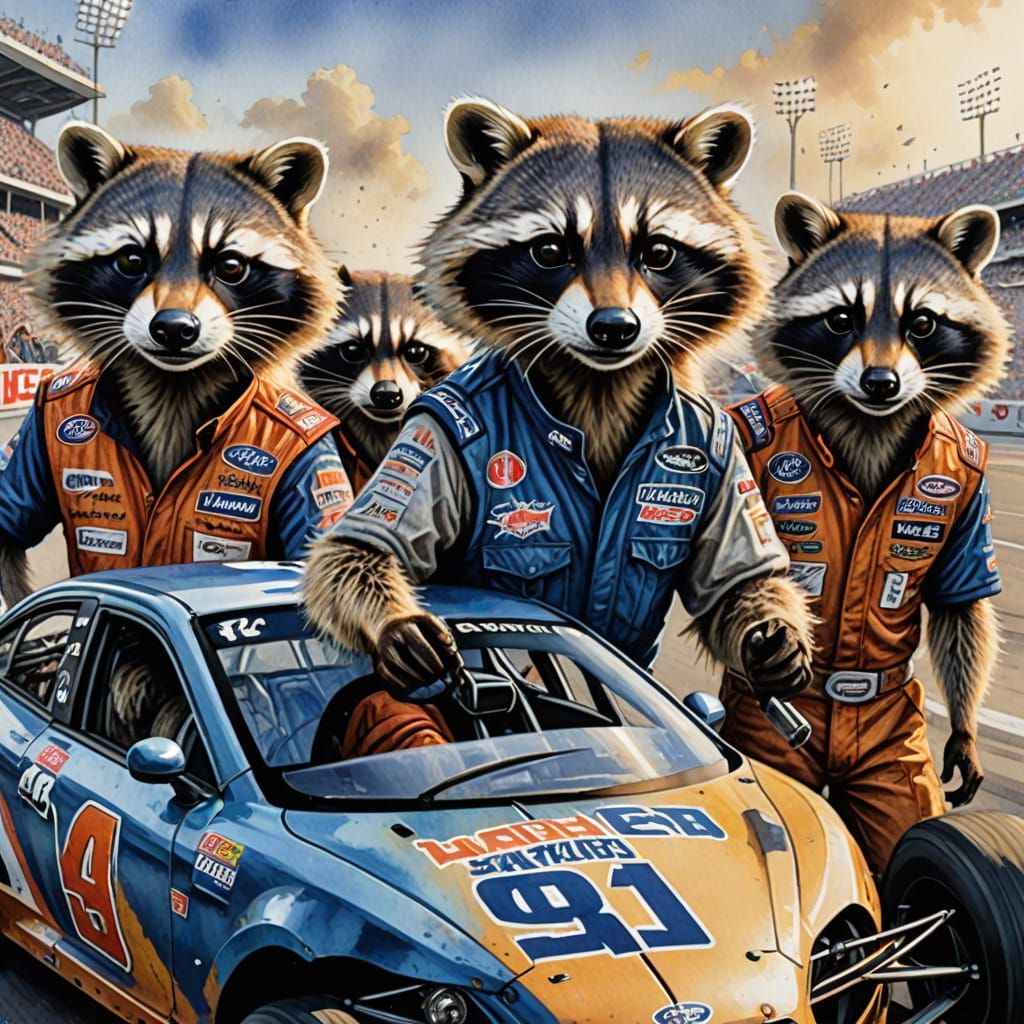 This image shows an anthropomorphic raccoon racing team in a hyperrealistic style. The watercolor effect gives the image a soft, artistic touch.
