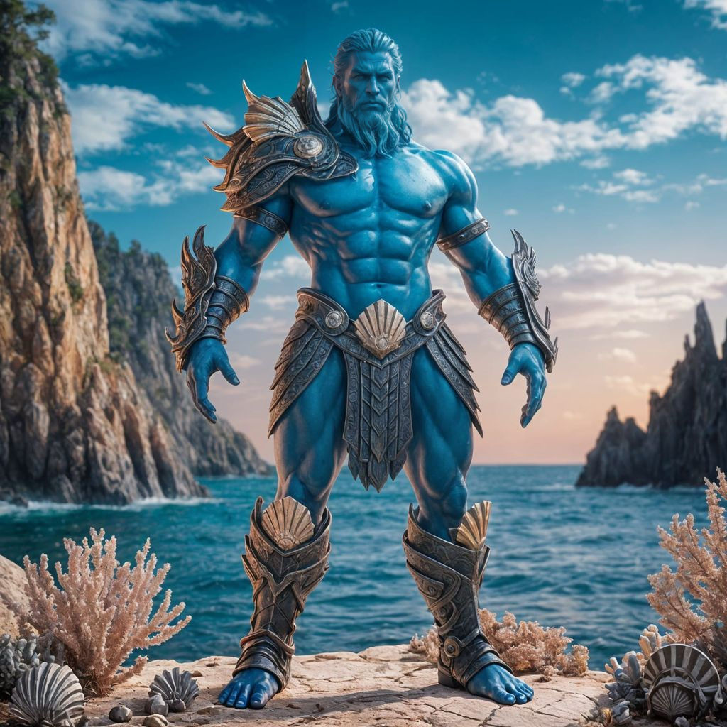 This image shows a powerful male triton warrior standing heroically against a scenic coastal backdrop, with intricate dark armor and vibrant aquatic blue skin. The artwork showcases triadic color harmony and detailed lighting, creating a stunning splash art piece.