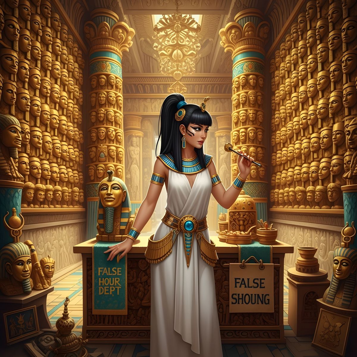 This image shows a merchant in an ornate temple, selling idols. The scene is rendered with intricate details and vibrant colors, in a style reminiscent of Baroque painting and digital art.