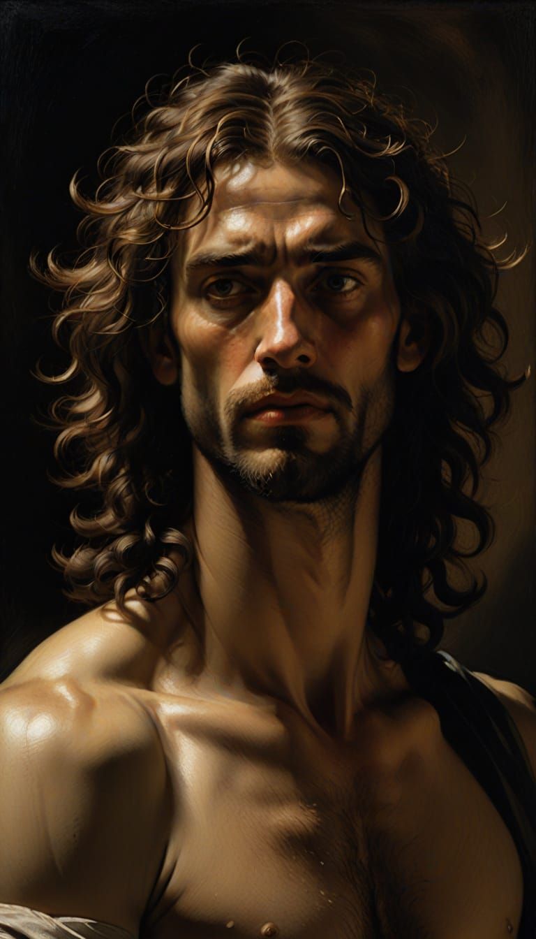 A striking picture of a male figure in a loincloth, bathed in golden light with deep shadows, rendered in a baroque style. The oil painting captures emotional tension and introspection.