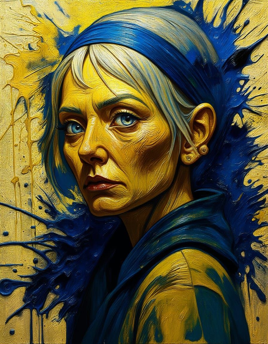 This striking image features a Ukrainian woman in a full-body portrait, rendered with bold ink splatters. It showcases mesmerizing eyes, short blonde hair, and dramatic lighting in a colorful, high-contrast style.