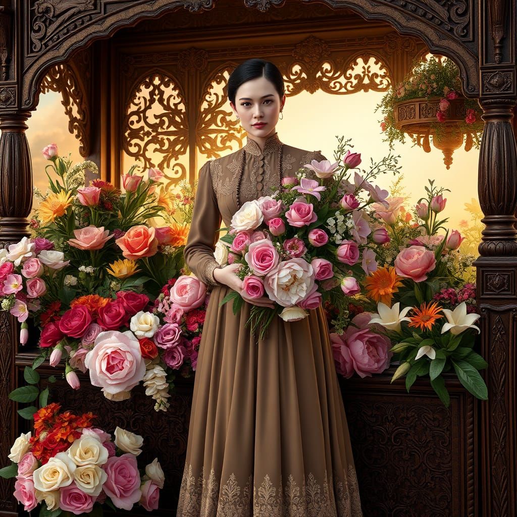 This image shows a Victorian flower seller in a lace-trimmed dress, standing by her ornate wooden stall filled with exotic flowers. She holds a bouquet of peonies, roses, and lilies, depicted in a Pre-Raphaelite style.