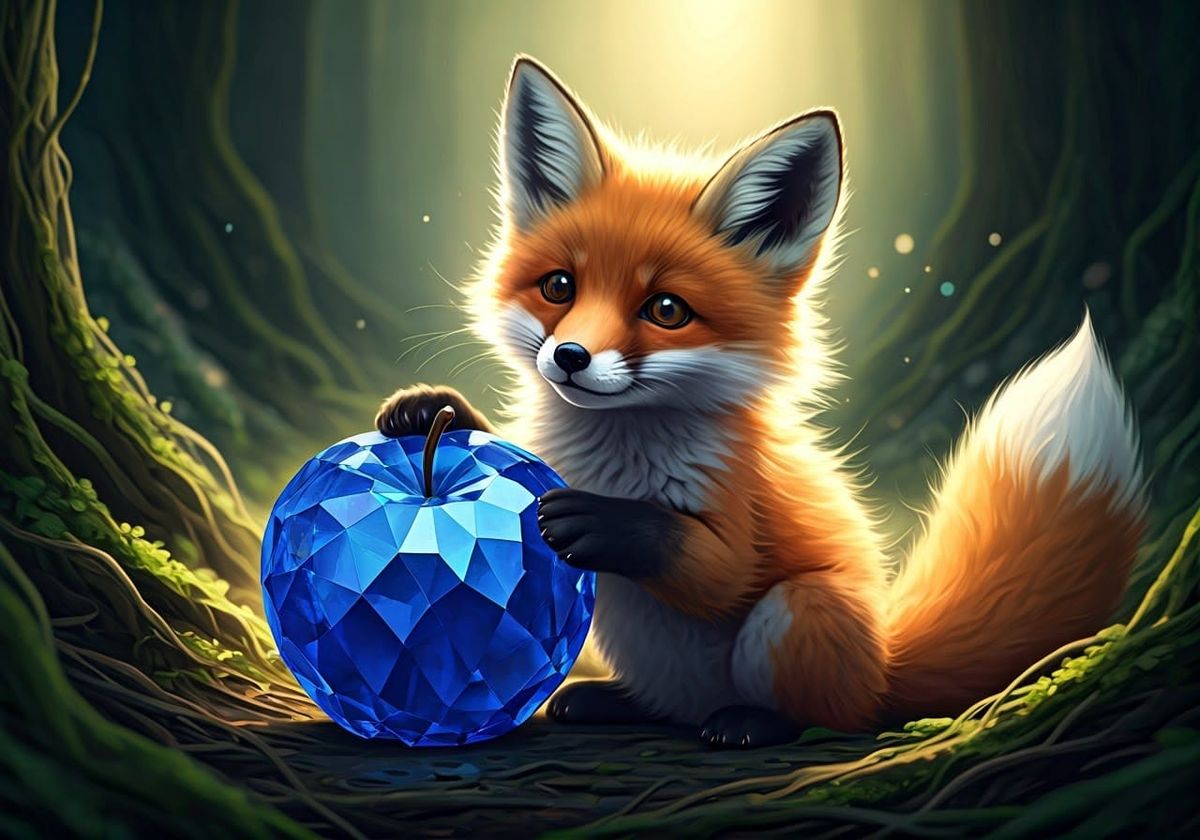 A charming image of a fluffy fox cub with large eyes playing with a sapphire apple in a sunlit forest. This artwork evokes a whimsical fantasy illustration.