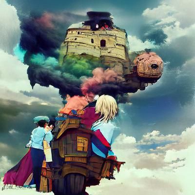 This image shows a scene from Howl's Moving Castle, rendered with detailed environments and character designs. The artwork captures the magical and whimsical nature of the film.